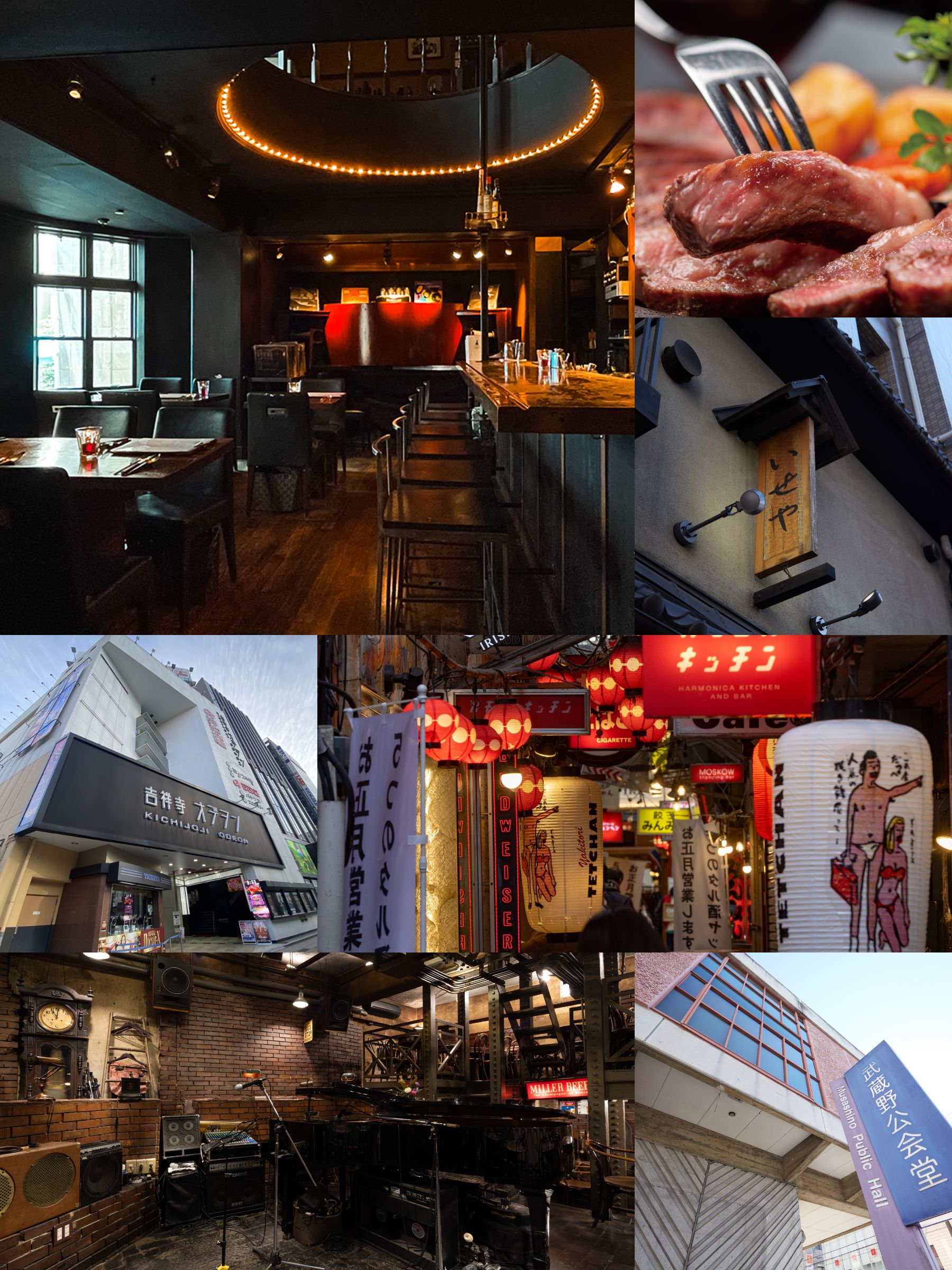 「吉祥寺」駅北側の様々なお店が密集する飲食店街。他の商店街とは異なるディープな雰囲気が、食事の時間を特別なものにしてくれる。路地の入り口が並ぶ様子がハーモニカの吹口に似ていることが名前の由来になったと言われている。