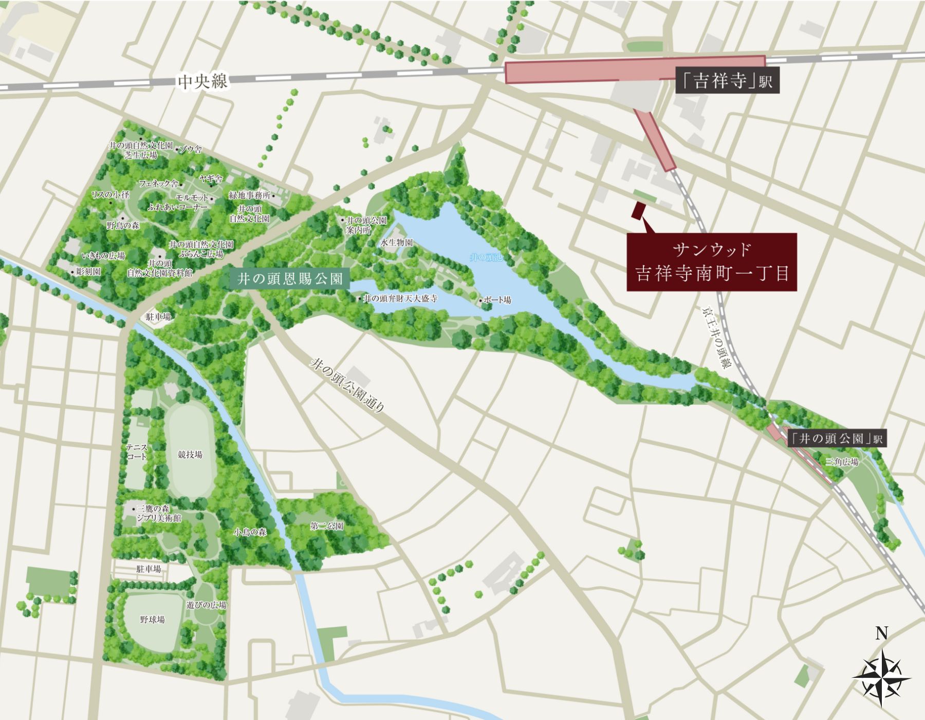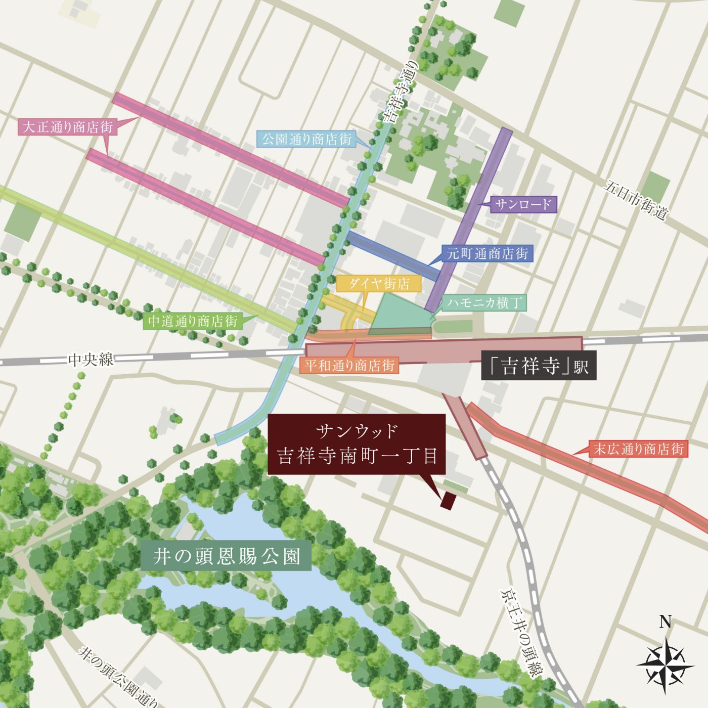 風光明媚な井の頭恩賜公園や駅周辺の商店街など、