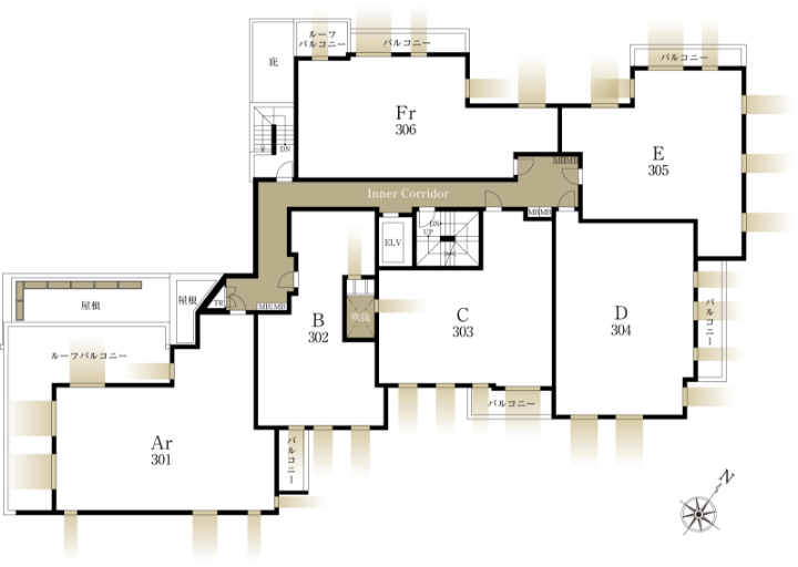 共用廊下側に窓を配さない設計。