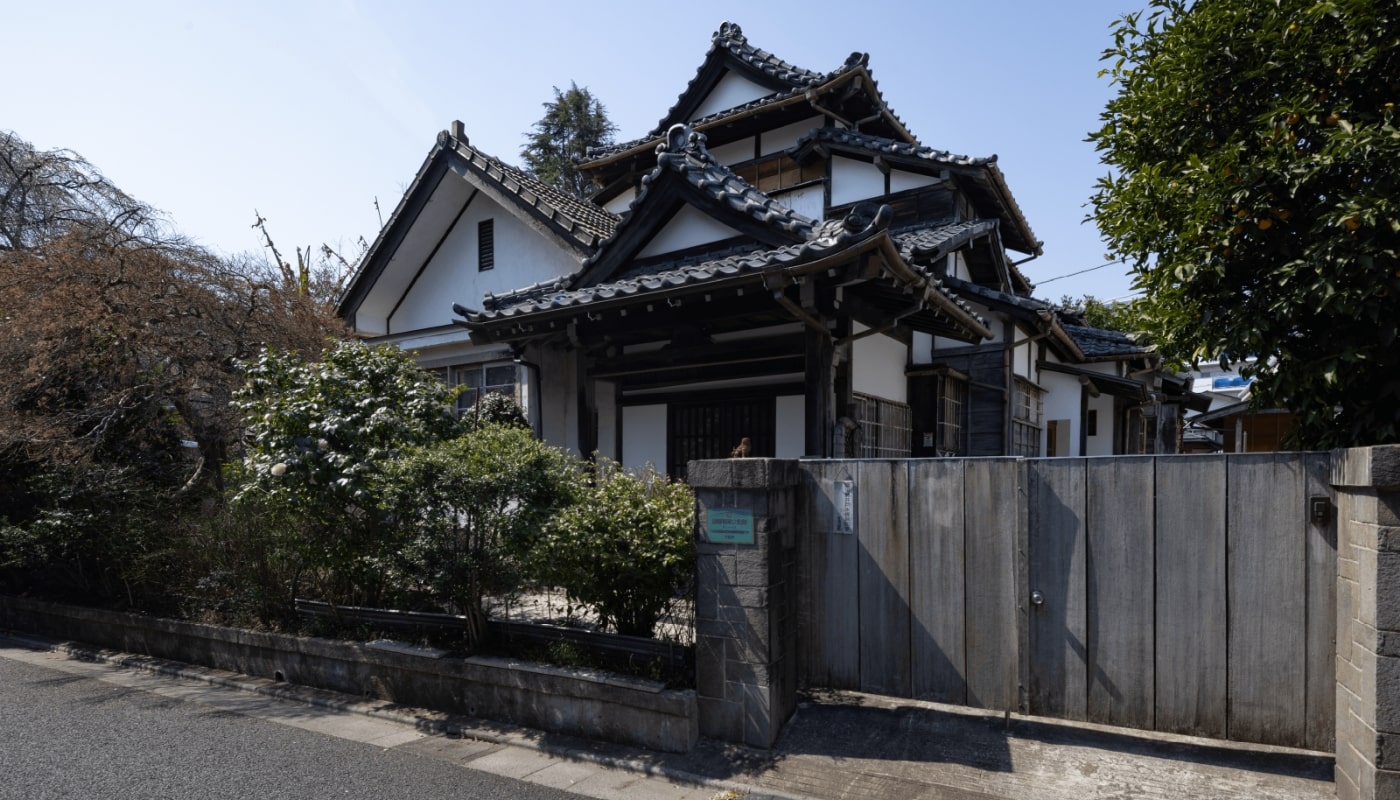 住宅街に広い庭園をもつ洋館付二階建和風住宅。入母屋造桟瓦葺で、洋館は切妻造フランス瓦葺。玄関を東面道路に向け、玄関脇に洋館、東西に中廊下平面とする。中央続き間座敷の東西に階段を配して動線を公私で分け、各所に覗き窓を配し、要人の応接に備える。
