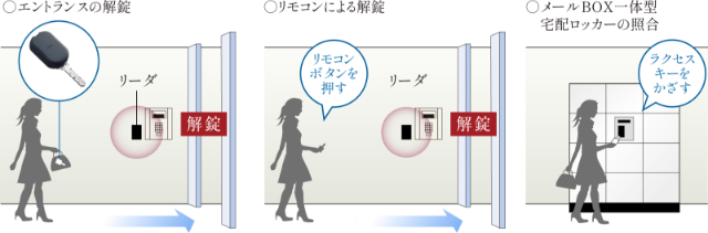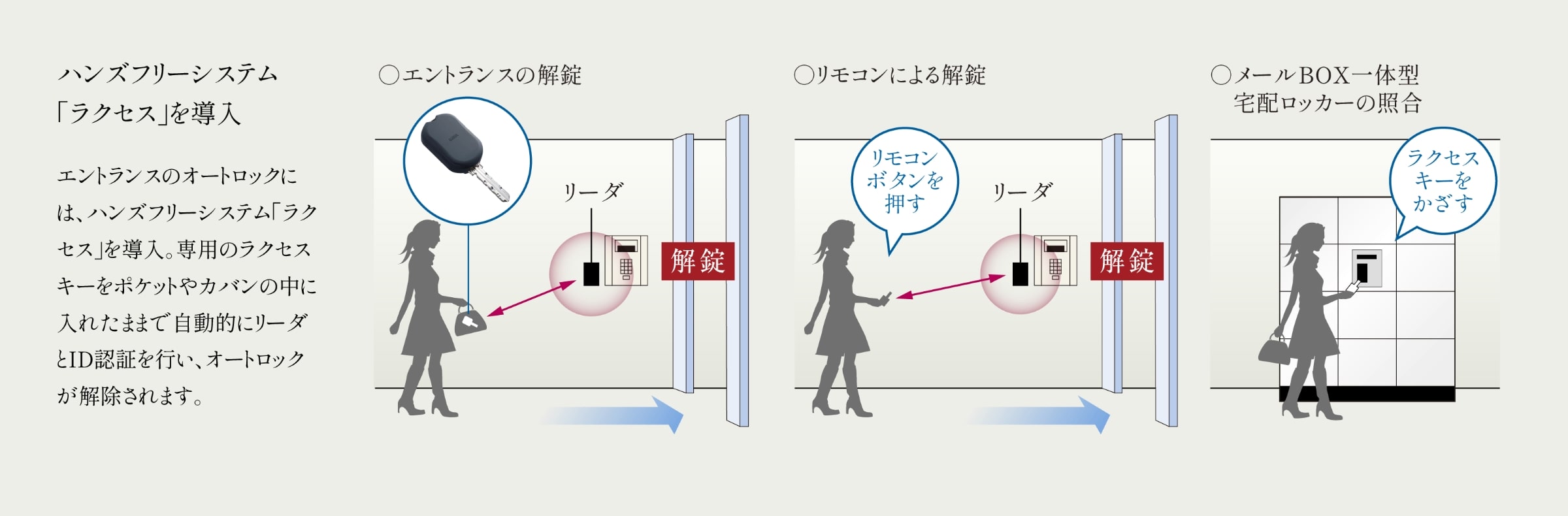 「ラクセス」概念図 ハンズフリーシステム「ラクセス」を導入エントランスのオートロックには、ハンズフリーシステム「ラクセス」を導入。専用のラクセスキーをポケットやカバンの中に入れたままで自動的にリーダとID認証を行い、オートロックが解除されます。