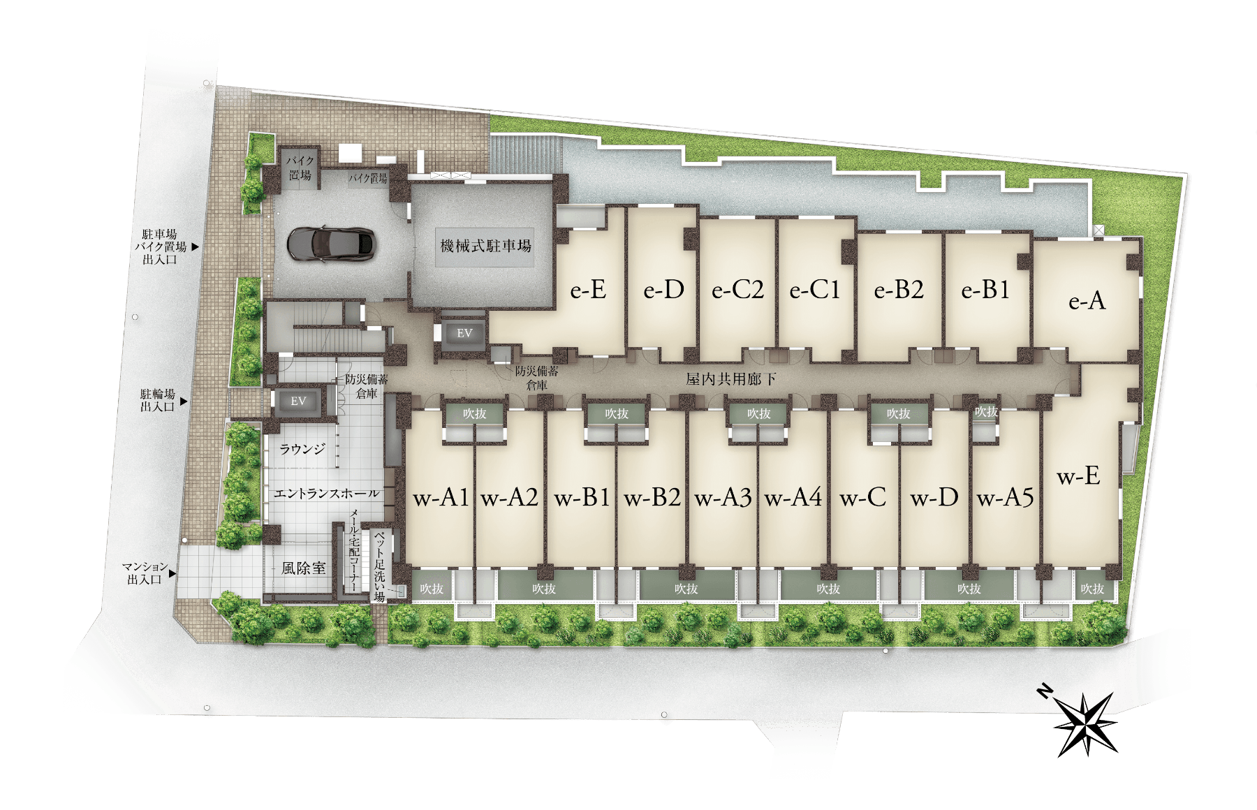 また、エントランス前にアプローチを設けるなど、重層的で奥行きのある住空間を生み出していきます。
